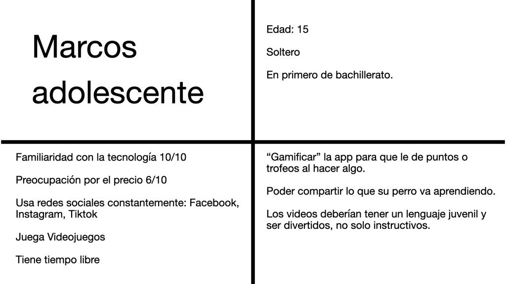A continuación te doy un ejemplo de cómo podrías crear a tus target personas. Supongamos que quieres hacer una app móvil con videos sobre cómo entrenar a tu perro (Idea original, no me la robes 👀😂, si tienes miedo de que roben tu idea checa este otro artículo), un posible target persona para esta app podría ser el siguiente: