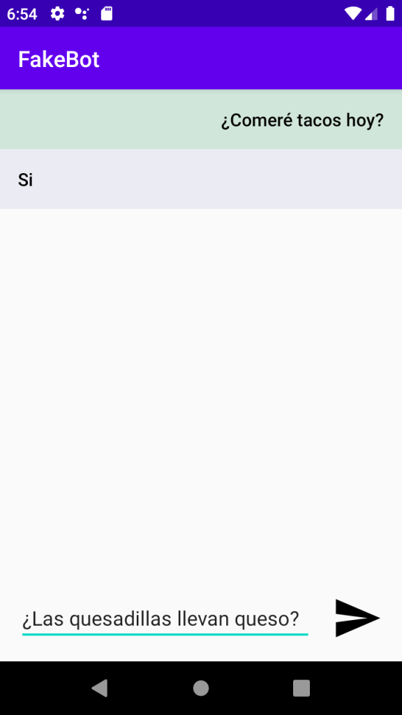 - Una vez que se agregue tu mensaje, la app deberá elegir una respuesta de las que insertaste de manera aleatoria y también agregarla al RecyclerView para simular que el Bot te respondió. Mira más abajo para consejos de cómo hacer esto.